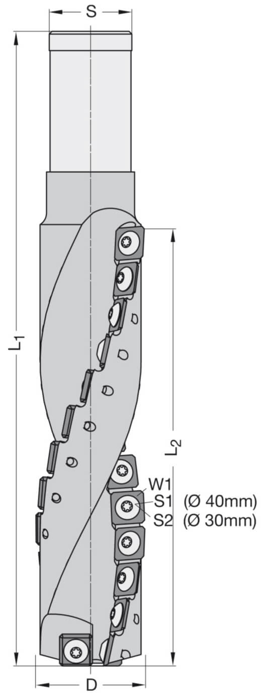 Spiraalvormige uitvoering met hoge stabiliteit. Alle snijkanten hebben een afgeschuinde hoeken (W1). Rechtsdraaiende uitvoering. Voor een mechanische doorvoer (MEC) geschikt. Andere uitvoeringen zijn op aanvraag leverbaar.