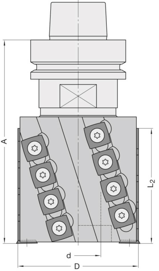 De body van zeer sterk lichtmetaal met een hard geanodiseerd oppervlak, met 18 geronde HW-wisselmesjes. Spiraalvormige mesopstelling met negatieve (naar beneden trekkende) snede voor hoge verspaningsprestatie. Snijverdeling om de snijkrachten terug te brengen tot 4 rijen snijkanten. Met twee HW omkeerbare voorsnijders. Rechtsdraaiend en voor mechanische doorvoer (MEC) geschikt. Gemonteerd op een HSK 63-F opname. De tussenring wordt meegeleverd.